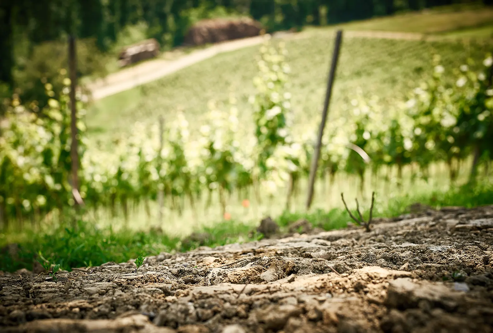 Aus dem Boden, der sich aus Braunerde mit Felsanteilen und Schiefer zusammensetzt, beziehen die Trauben ihre typische mineralische Komponente.